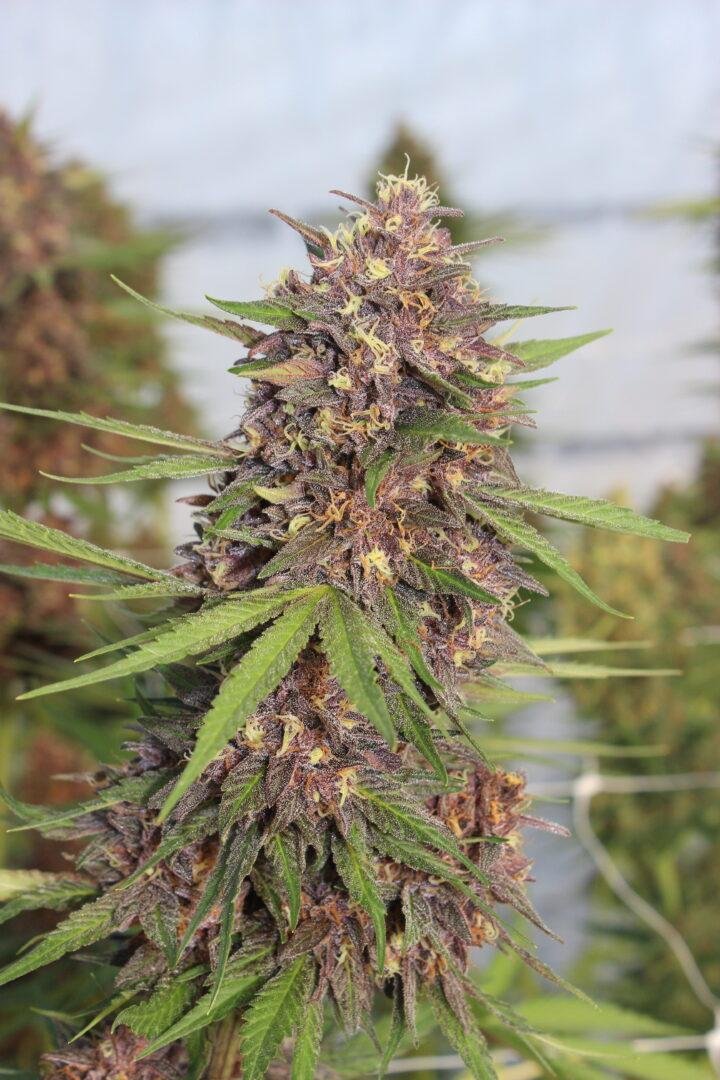 Ses buds XXL aux reflets violets scintillent sous une couche généreuse de trichomes, offrant une esthétique rare et captivante.